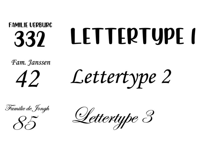 Het lettertype van familie Verburg is 2,5 cm hoog. Lengte afhankelijk van de aantal letters. Familie Verburg is 22cm lang.