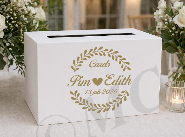 OverzichtLeuke sticker voor op een enveloppenbox ter ere van een huwelijk.