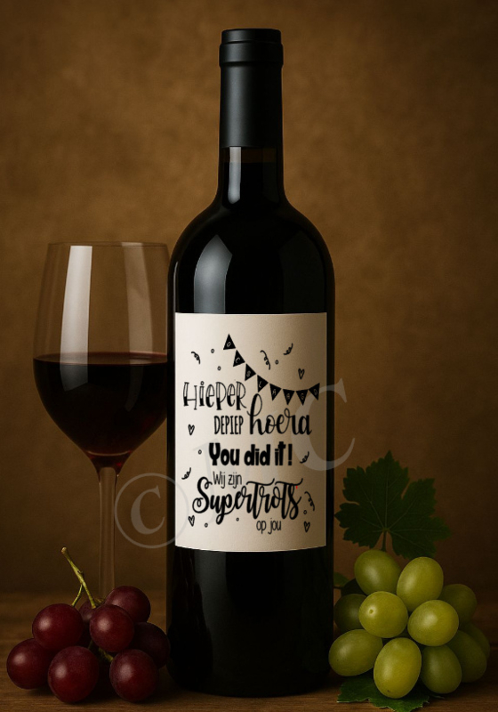 Wijnfles etiketten:  Deze worden in het zwart geprint op een papieren etiket. De maat van dit etiket is  104mm breed en ca 140mm hoog. Mocht dit te hoog zijn geef dit dan aan bij de opties dan kan het etiket maximaal 3 cm korter gemaakt worden.